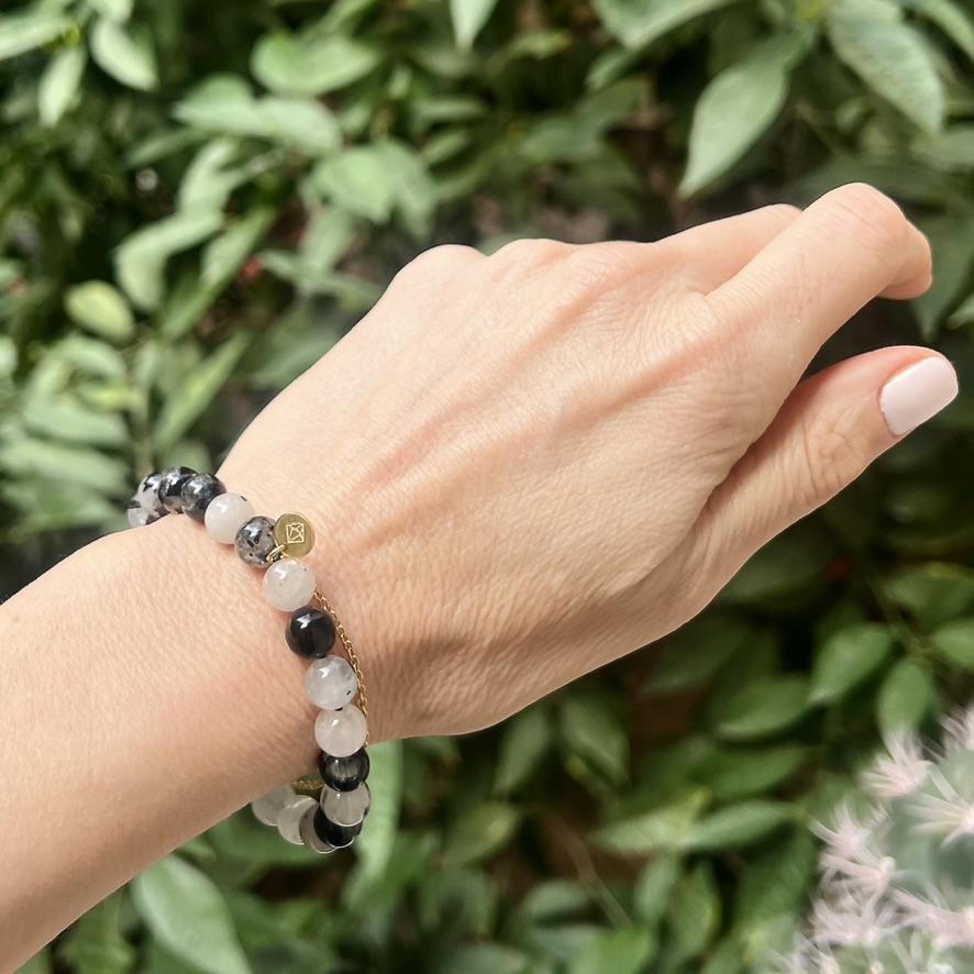 The Tourmalinated Quartz bracelet is your ultimate natural talisman! Combining the clear light of Quartz with the powerful protection of Tourmaline, this unique crystal is the master of transformation. It takes any negative mental attitude and instantly converts it into pure, bright positivity.