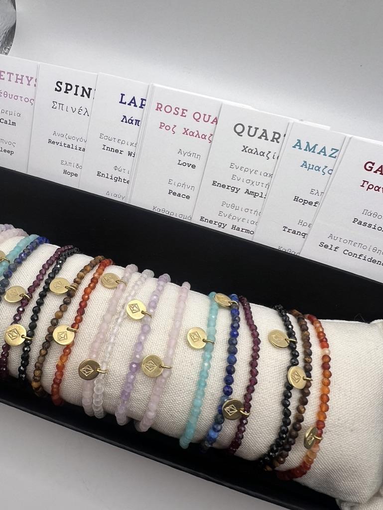 Ροζ Χαλαζίας, Αμέθυστος Lavender, Διάφανος Χαλαζίας, Γρανάτης, Σπινέλιος, Λάπις Λάζουλι, Αμαζονίτης, Καρνεόλη και Μάτι της Τίγρης.