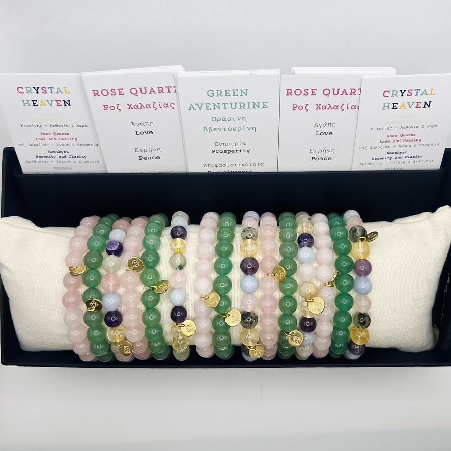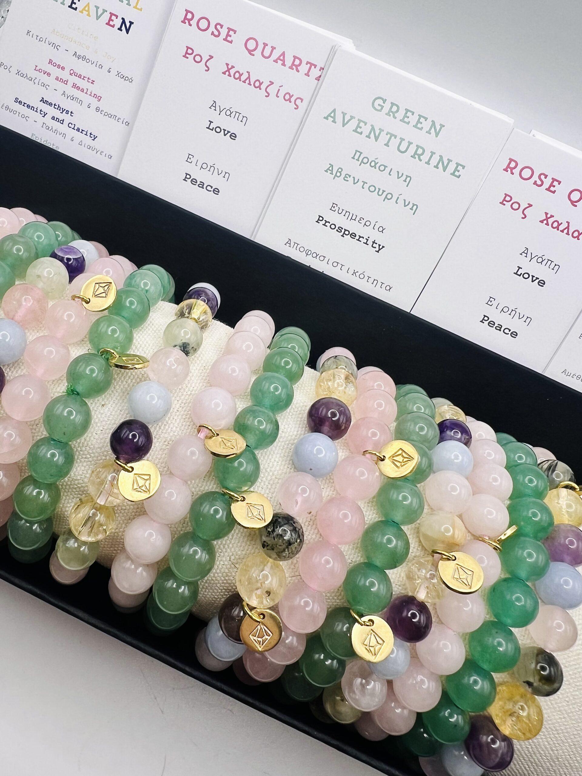 Ροζ Χαλαζία, Πράσινη Αβεντουρίνη & Crystal Heaven: Κιτρίνης, Ροζ Χαλαζίας, Αμέθυστος, Επιδοτο & Μπλέ Χαλκιδόνιο.
